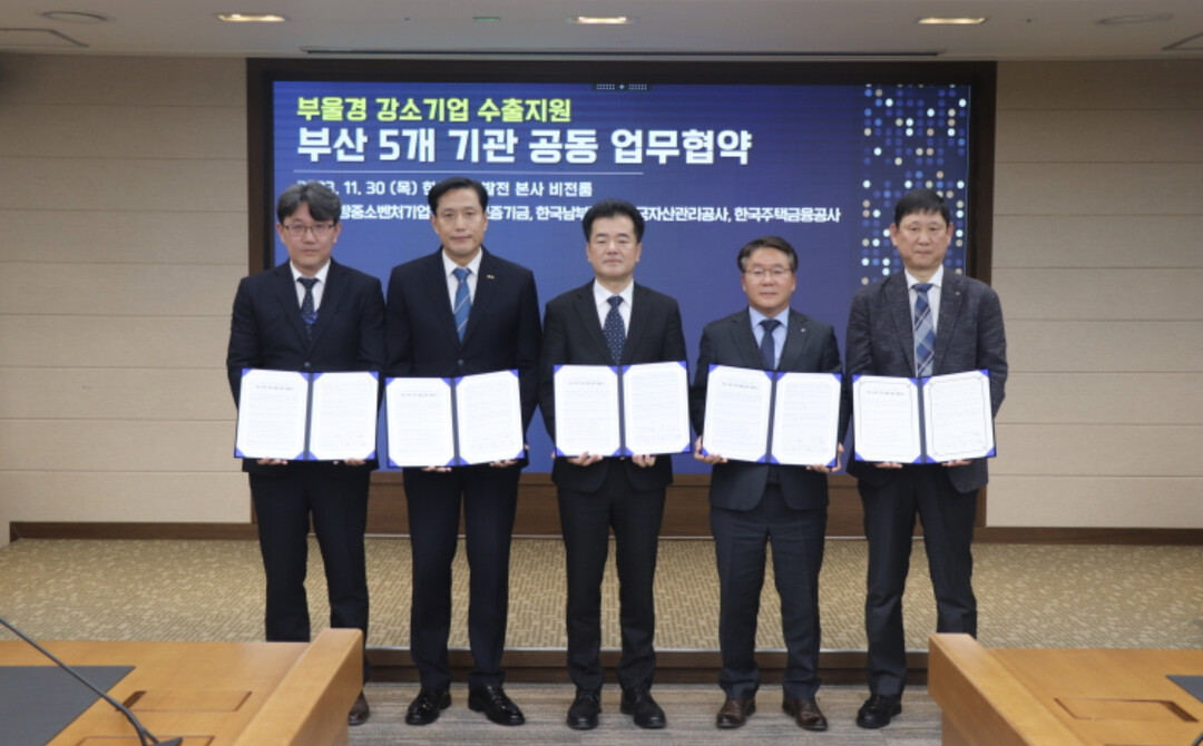 한국남부발전, 부산지방중소벤처기업청, 기술보증기금, 한국자산관리공사, 한국주택금융공사 등 부산지역 5개 기관이 부·울·경 소재 수출 강소기업 육성을 위해 손을 맞잡는다.